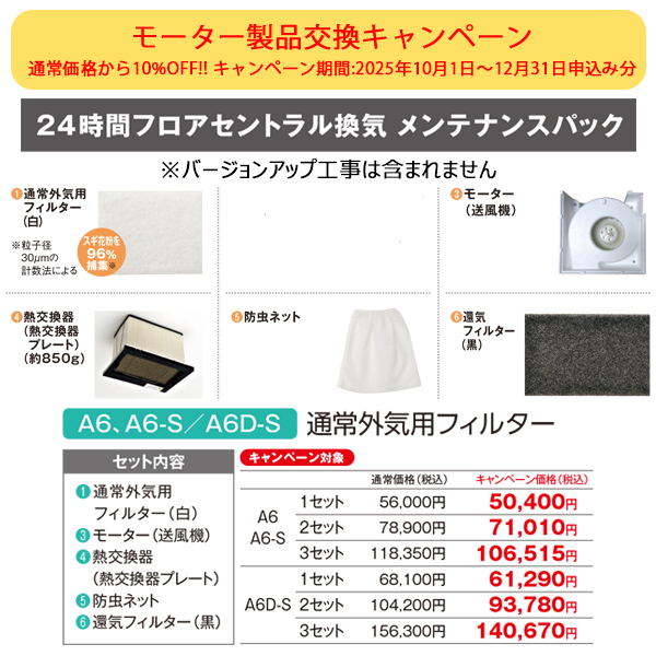 ・バージョンアップ工事後の交換用フィルターはPM2.5対応のA6D-MEタイプ、またはPM2.5非対応のA6D-Sタイプのいずれかをお選びいただけます。A6タイプ(MEAS-6)のフィルターは使用できませんのでご注意ください。
